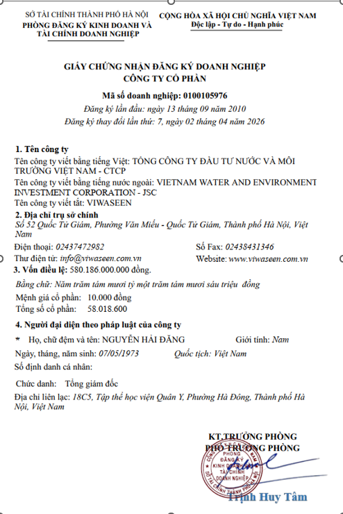 Tổng công ty Đầu tư nước và Môi trường Việt Nam – CTCP xin kính gửi Quý cổ đông và Quý khách hàng công bố thông tin thay đổi Giấy chứng nhận Đăng ký Doanh nghiệp số 0100105976, đăng ký thay đổi lần 7 ngày 03/04/2026.