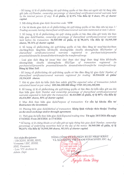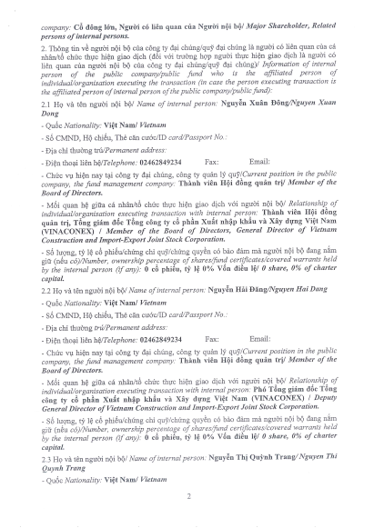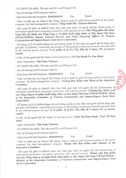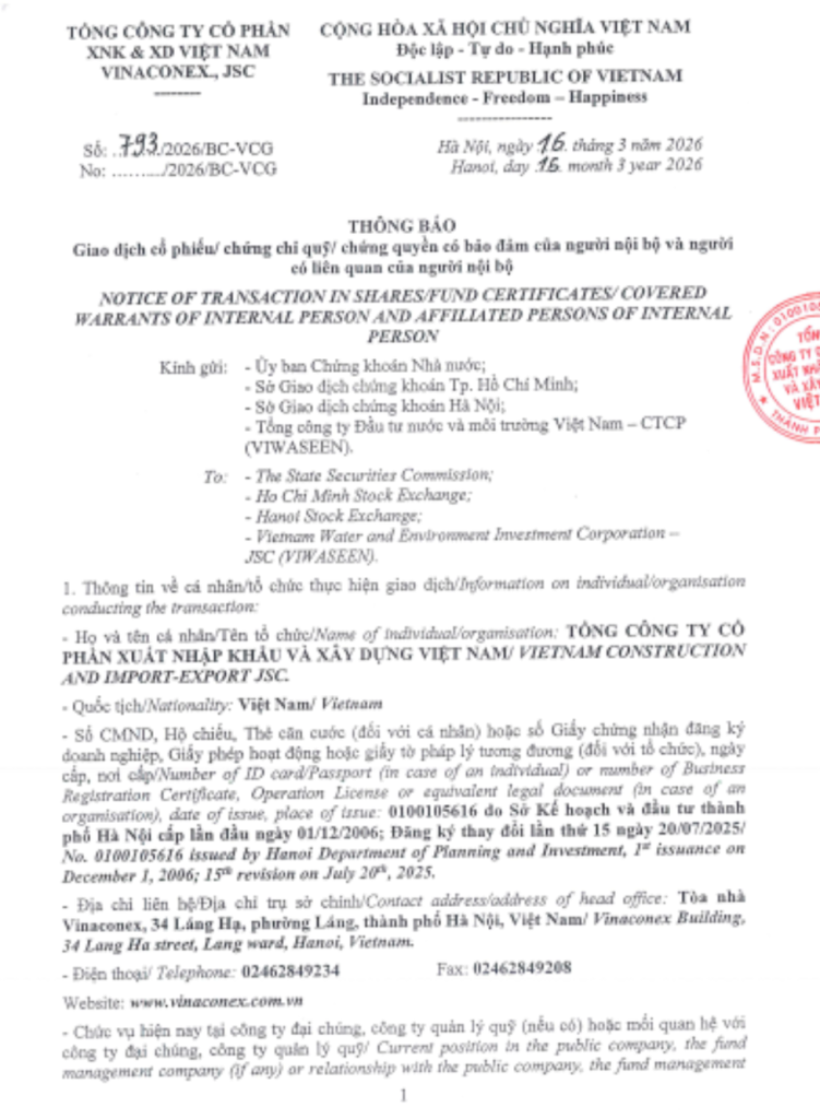 Tổng công ty VIWASEEN thông báo giao dịch cổ phiếu của người nội bộ, người có liên quan của người nội bộ (TCT Cổ phần VINACONEX).