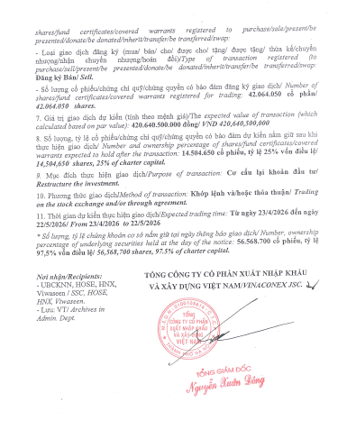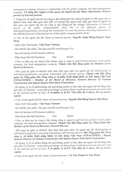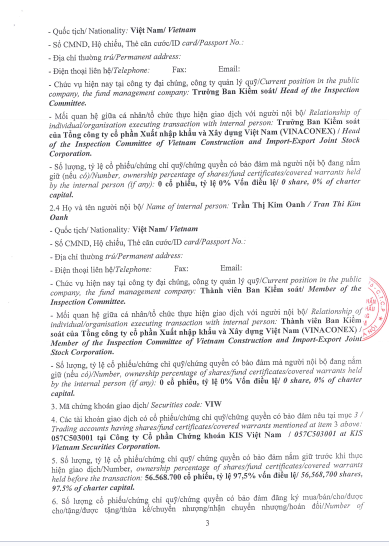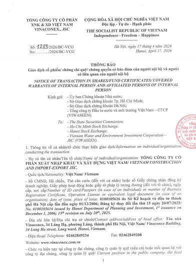 Tổng công ty VIWASEEN thông báo Giao dịch Cổ phiếu của Người nội bộ, Người có liên quan của Người nội bộ (TCTy Cổ phần VINACONEX).