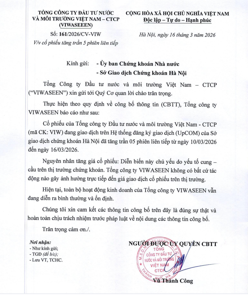 Cổ phiếu của Tổng công ty VIWASEEN (mã CK: VIW) đã tăng trần 05 phiên liên tiếp trong các phiên ngày 06/3/2026 và từ ngày 10/03/2026 đến ngày 13/03/2026.