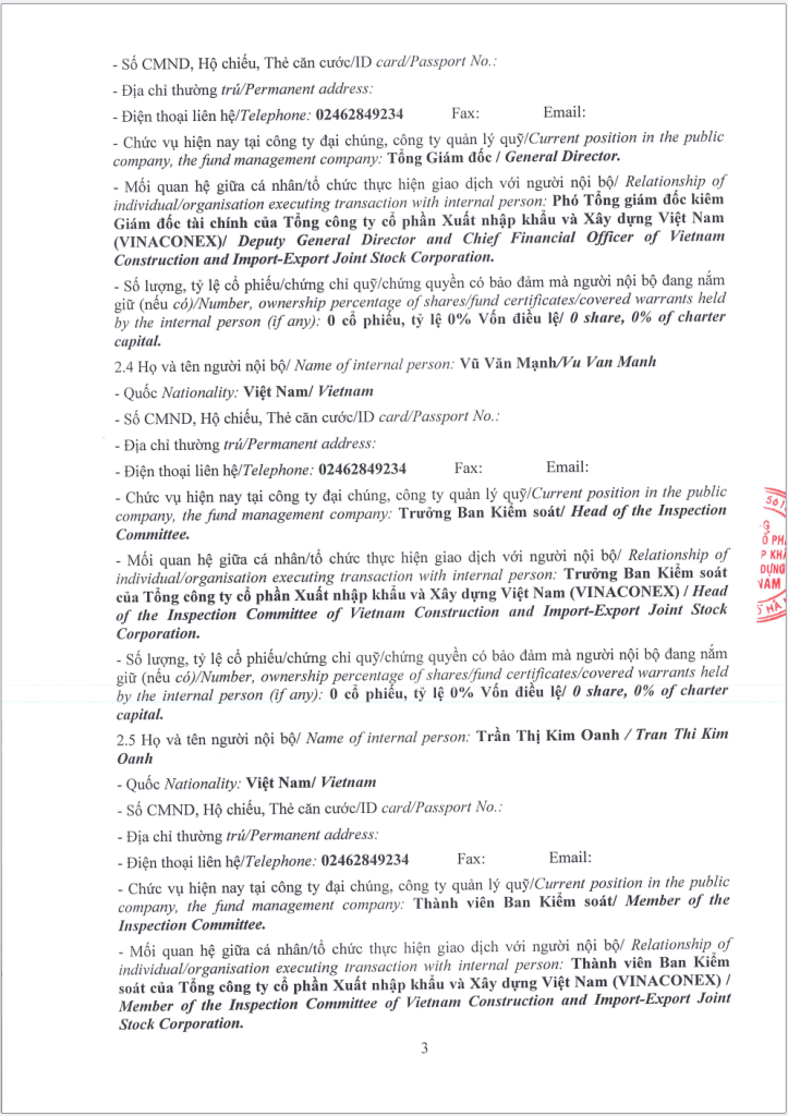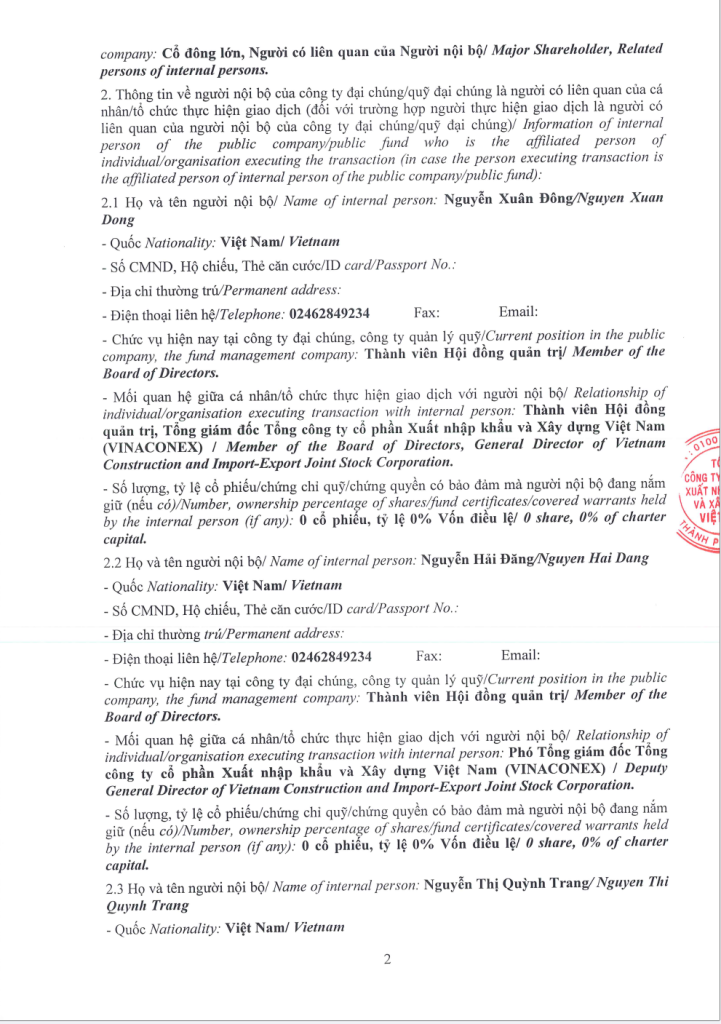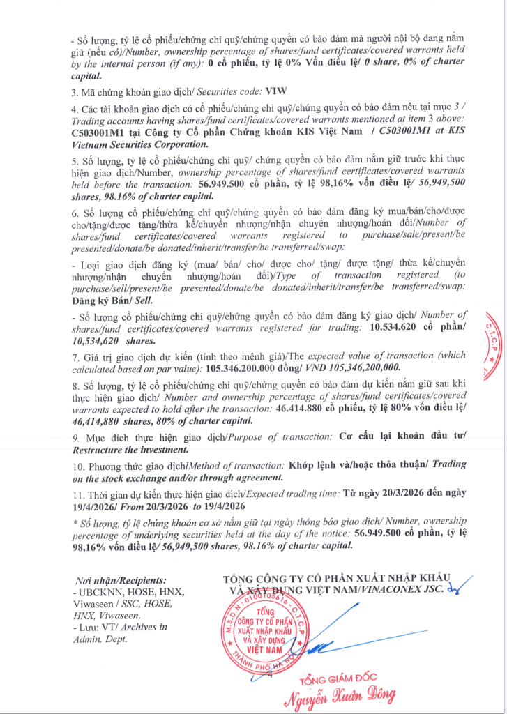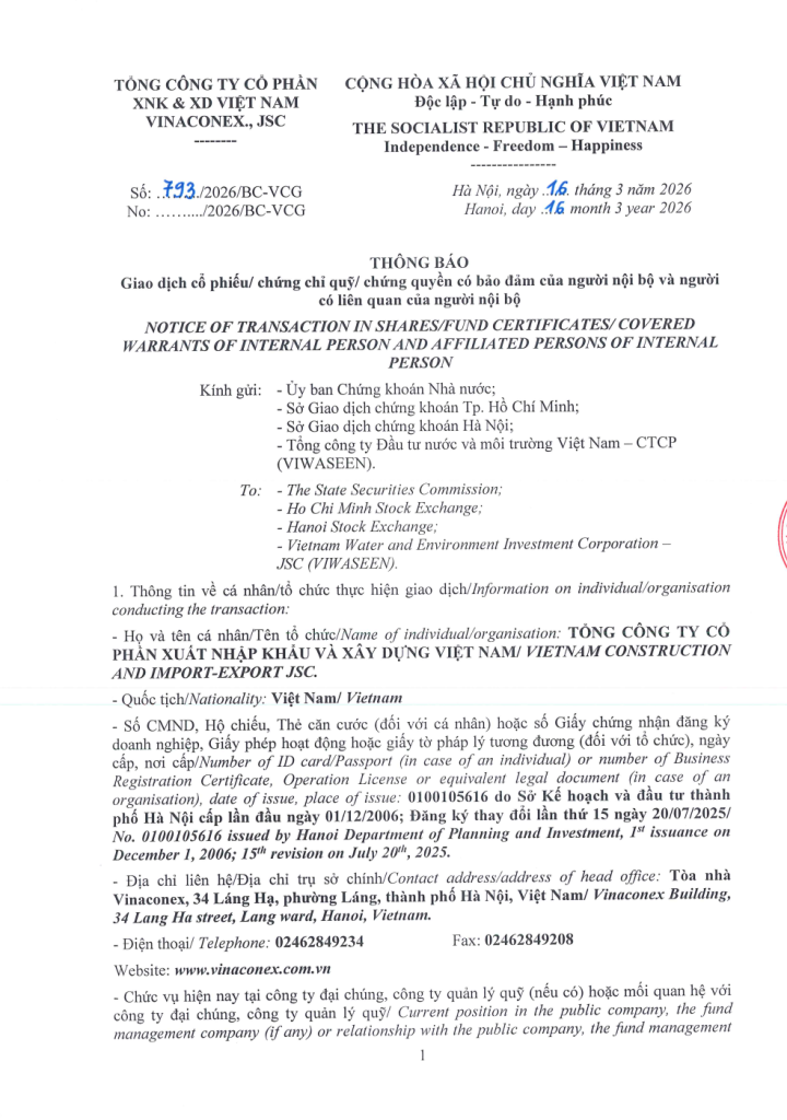 Tổng công ty VIWASEEN thông báo giao dịch cổ phiếu của người nội bộ, người có liên quan của người nội bộ (TCT Cổ phần VINACONEX).