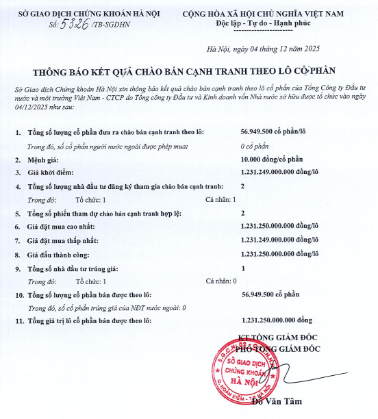 Tổng công ty Đầu tư nước và môi trường Việt Nam – CTCP xin thông báo kết quả chào bán cạnh tranh theo lô cổ phần của SCIC tại Tổng công ty đầu tư nước và môi trường Việt Nam – CTCP được tổ chức vào ngày 04/12/2025 như sau:
